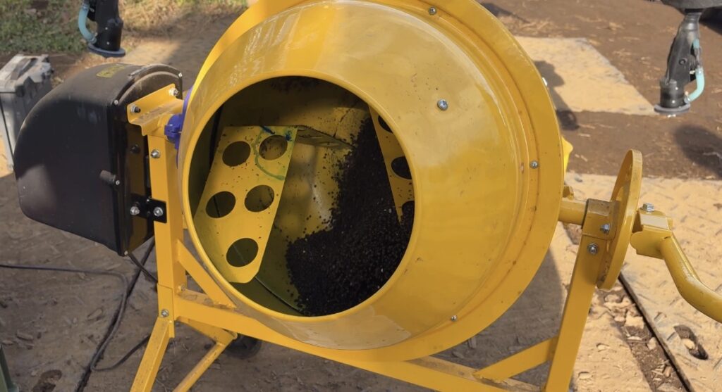 今回の実証では、ドローンを用いた緑肥散布に加え、マイコス(菌資材)を混用して散布を行いました。