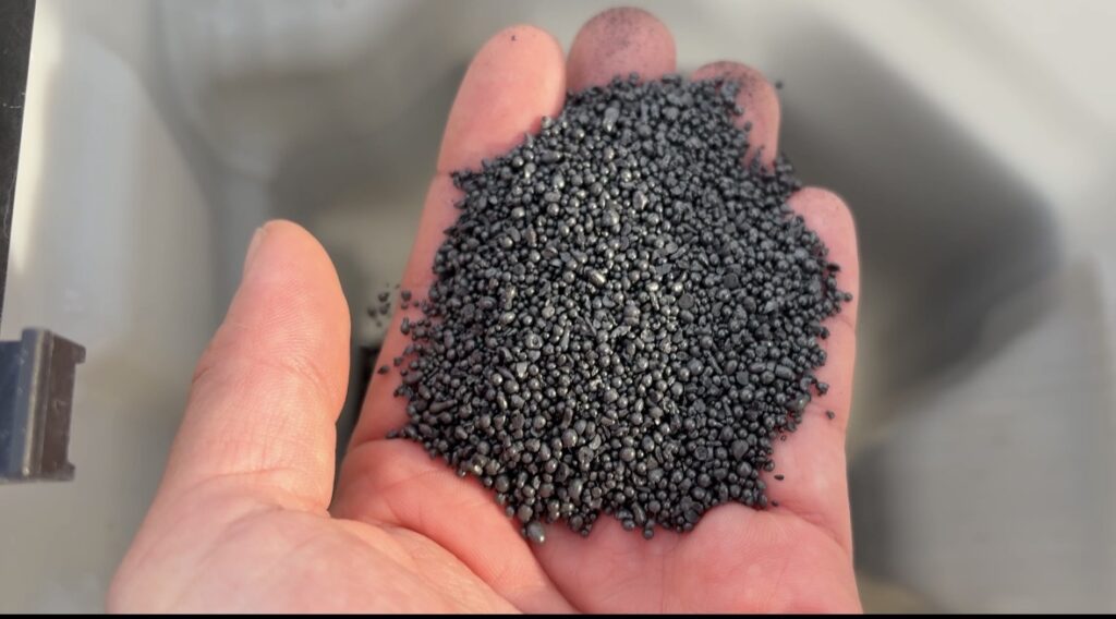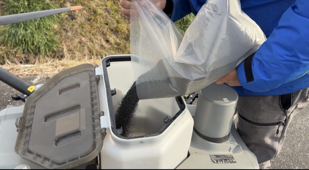 比重が重いのでよく飛んでいた印象です。粒径は小さいので開度に気をつけながら散布しました。またこういった鉄を含有した資材は最後にべちゃついてどうしてもシャッターに残ってしまうことが課題ですが、洗ってしまえば問題ありません。